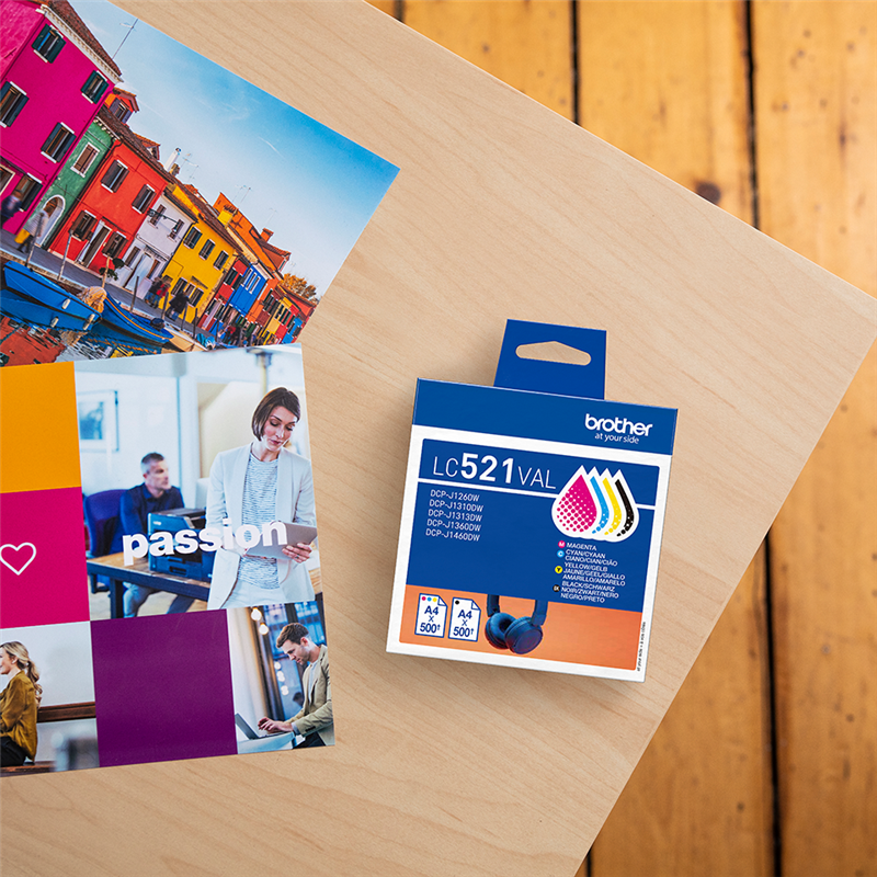 Brother LC521VAL multipack black / cyan / magenta / yellow (LC521VAL) (LC521VAL) Brother LC521VAL Genuine Ink Cartridge Value Pack, Black, Cyan, Magenta, Yellow, 4 pc(s), 500 pages, 500 pages, Multi pack ~2.000 pages 527,30 kr.-10%474,82 kr.VAT incl., free shipping directly from stock Delivery time 1-2 days add to basket Content LC521BK black ~500 pages 30,0 p / page LC521C cyan ~500 pages 21,6 p / page LC521M magenta ~500 pages 21,6 p / page LC521Y yellow ~500 pages 21,6 p / page Product information "Brother LC521VAL multipack black / cyan / magenta / yellow"multipack black / cyan / magenta / yellow ~2.000 pages Brother LC521VAL Genuine Ink Cartridge Value Pack, Black, Cyan, Magenta, Yellow, 4 pc(s), 500 pages, 500 pages, Multi pack Read moreread lessSuitable for the following printersBrother DCP-JDCP-J1260WDCP-J1310DWDCP-J1360DWDCP-J1460DWtechnical dataPackaging dataPackage weight220 gPackage depth111 mmPackaging contentQuantity per pack4 pc(s)Packaging dataPackage height109.5 mmPackage width69 mmWeight & dimensionsWeight200 gHeight85 mmDepth75 mmWidth10 mmFeaturesTypeOriginalCompatibilityDCP-J1260W, DCP-J1310DW, DCP-J1313DW, DCP-J1360DW, DCP-J1460DWPrinting colours Black, Cyan, Magenta, YellowBrand compatibilityBrotherBlack ink page yield500 pagesColour ink page yield500 pagesSupply typeMulti packAll details without engagement. Data source: IceCatManufacturer information on product safety (GPSR)Brother International (Nederland) B.V.Zanderij 251185 ZM Amstelveen E-mail: brother@brother.de Suitable accessories for your printer Original Brother LC521BK black ink cartridgecolourTape Width Size colour: Page number:~500 pagesPage price:33,4 p / page166,76 kr.VAT incl., free shipping directly from stock add to basket directly from stock add to basket directly from stock add to basket directly from stock add to basket Price / performance winner compatible with Brother LC521BK black Prindo Classic black ink cartridgecolourTape Width Size colour: Page number:~500 pagesPage price:20,4 p / page102,12 kr.VAT incl., free shipping directly from stock add to basket Delivery date unknown add to basket directly from stock add to basket directly from stock add to basket Original Brother Ink cartridge for your printer. Brother LC521BK black ink cartridgecolourTape Width Size:Standard colour: Page number:~500 pagesPage price:33,4 p / page166,76 kr.VAT incl., free shipping directly from stock add to basket Brother LC521C cyan ink cartridgecolourTape Width Size:Standard colour: Page number:~500 pagesPage price:24,0 p / page120,18 kr.VAT incl., free shipping directly from stock add to basket Brother LC521M magenta ink cartridgecolourTape Width Size:Standard colour: Page number:~500 pagesPage price:24,0 p / page120,18 kr.VAT incl., free shipping directly from stock add to basket Brother LC521Y yellow ink cartridgecolourTape Width Size:Standard colour: Page number:~500 pagesPage price:24,0 p / page120,18 kr.VAT incl., free shipping directly from stock add to basket Our price / performance winners Compatible Prindo Classic Ink cartridge for your printer.✅ Level indicator ✅ More printing performance ✅ 5-year warranty ✅ No loss of warranty for your printer compatible with Brother LC521BK black Prindo Classic black ink cartridgecolourTape Width Size:Standard colour: Page number:~500 pagesPage price:20,4 p / page102,12 kr.VAT incl., free shipping directly from stock add to basket compatible with Brother LC521C cyan Prindo Classic cyan ink cartridgecolourTape Width Size:Standard colour: Page number:~500 pagesPage price:14,7 p / page73,68 kr.VAT incl., plus shipping costs Delivery date unknown add to basket compatible with Brother LC521M magenta Prindo Classic magenta ink cartridgecolourTape Width Size:Standard colour: Page number:~500 pagesPage price:14,7 p / page73,68 kr.VAT incl., plus shipping costs directly from stock add to basket compatible with Brother LC521Y yellow Prindo Classic yellow ink cartridgecolourTape Width Size:Standard colour: Page number:~500 pagesPage price:14,7 p / page73,68 kr.VAT incl., plus shipping costs directly from stock add to basket Your product is right in your shopping cart! Select your printer to make sure the selected product fits for you.Loading...
