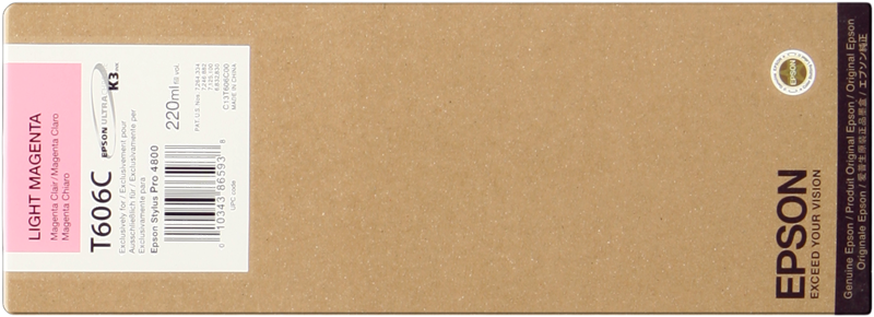 Epson T606C magenta (light) ink cartridge (C13T606C00) (C13T606C00) ink cartridge magenta (light) 220ml 1.002,01 kr.VAT incl., free shipping directly from stock Delivery time 1-2 days add to basket T6061 Black (photo) 220ml 1.005,22 kr. T6067 lightblack 220ml 994,32 kr. T6069 lightlightblack 220ml 1.005,22 kr. T6062 cyan 220ml 1.005,22 kr. T6065 cyan (light) 220ml 983,35 kr. T606B magenta 220ml 1.002,01 kr. T606C magenta (light) 220ml 1.002,01 kr. T6064 yellow 220ml 994,32 kr. Product information "Epson T606C magenta (light) ink cartridge C13T606C00"Epson's ink has been specifically designed to work with your Epson printer. For the best printing results, make sure you use only genuine Epson printer inks. When you depend on quality printed material you can rely on original Epson ink supplies to give you great results every time. Whatever Epson printer you have, you’ll find the right ink supplies you need for it here. Read moreread lessSuitable for the following printersEpson Stylus ProStylus Pro 4800technical dataLogistics dataProducts per pallet layer (UK)192 pc(s)Products per pallet layer144 pc(s)Products per pallet (UK)1920 pc(s)Pallet height (UK)1830 mmPallet length (UK)1200 mmPallet width (UK)1000 mmQuantity per master carton24 pc(s)Master (outer) case height183 mmMaster (outer) case length443 mmMaster (outer) case width293 mmPallet height1830 mmPallet length1200 mmPallet width800 mmPackaging contentQuantity per pack1 pc(s)Technical detailsCountry of originChinaFeaturesColourYesPrint technologyInkjetPrinting colours Light magentaQuantity1Compatible productsStylus Pro 4800Capacity220 mlOEM codeC13T606C00Ink typePigment-based inkOriginalYesColour ink volume220 mlquantity of coloured inks 1MultipackNoCompatibilityStylus Pro 4800Brand compatibilityEpsonTypeOriginalPackaging dataPackage typeProducts per pallet1440 pc(s)Package weight0.43 gPackage height110 mmPackage depth290 mmPackage width30 mmAll details without engagement. Data source: IceCatManufacturer information on product safety (GPSR)Epson Deutschland GmbHSchiessstraße 4940549 Düsseldorf E-mail: info@epson.de Website: https://www.epson.de/de_DE Your product is right in your shopping cart! Select your printer to make sure the selected product fits for you.Loading...