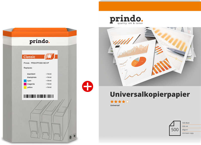 Prindo Classic Black (matt) / Black (photo) / cyan / magenta / yellow / White value pack (PRSCPFI300 MCVP) value pack Black (matt) / Black (photo) / cyan / magenta / yellow / White 469,52 kr.VAT incl., free shipping Delivery date unknown add to basket Content Prindo Classic Black (matt) ~1.750 pages 5,0 p / page Prindo Classic Black (photo) ~303 pages 30,0 p / page Prindo Classic cyan ~735 pages 11,8 p / page Prindo Classic magenta ~785 pages 11,4 p / page Prindo Classic yellow ~530 pages 16,7 p / page White Product information "Prindo Classic Black (matt) / Black (photo) / cyan / magenta / yellow / White value pack PRSCPFI300 MCVP"value pack Black (matt) / Black (photo) / cyan / magenta / yellow / White Prindo Promise: Top quality for a fair price, that is what our exclusive private label product line stand for Remanufactured original toners and cartridges, working parts changes and only highest quality of colors and materials Only selected partners and suppliers 5 years guarantee on Prindo products – no loss of warranty for your printer Read moreread lessSuitable for the following printersCanon imagePROGRAF (iPF)iPF PRO-300Manufacturer information on product safety (GPSR)Media-Concept Bürobedarf GmbH Inselkammerstrasse 582008 Unterhaching E-mail: mail@prindo.dk Website: www.prindo.dk Suitable accessories for your printer Original Canon PFI-300mbk Black (matt) ink cartridge (4192C001)colourTape Width Size colour: Page number:~1.750 pagesPage price:8,2 p / page143,84 kr.VAT incl., free shipping directly from stock add to basket directly from stock add to basket directly from stock add to basket directly from stock add to basket directly from stock add to basket directly from stock add to basket directly from stock add to basket directly from stock add to basket directly from stock add to basket directly from stock add to basket directly from stock add to basket Price / performance winner compatible with Canon PFI-300mbk Black (matt) (4192C001) Prindo Classic Black (matt) ink cartridgecolourTape Width Size colour: Page number:~1.750 pagesPage price:5,0 p / page88,08 kr.VAT incl., plus shipping costs directly from stock add to basket directly from stock add to basket directly from stock add to basket directly from stock add to basket directly from stock add to basket directly from stock add to basket directly from stock add to basket directly from stock add to basket directly from stock add to basket directly from stock add to basket Original Canon multipack for your printer. Canon PFI-300mbk Black (matt) ink cartridge (4192C001)colourTape Width Size:Standard colour: Page number:~1.750 pagesPage price:8,2 p / page143,84 kr.VAT incl., free shipping directly from stock add to basket Canon PFI-300pbk Black (photo) ink cartridge (4193C001)colourTape Width Size:Standard colour: Page number:~303 pagesPage price:48,9 p / page148,17 kr.VAT incl., free shipping directly from stock add to basket Canon PFI-300c cyan ink cartridge (4194C001)colourTape Width Size:Standard colour: Page number:~735 pagesPage price:19,3 p / page142,13 kr.VAT incl., free shipping directly from stock add to basket Canon PFI-300pc cyanfoto ink cartridge (4197C001)colourTape Width Size:Standard colour: Page number:~625 pagesPage price:24,2 p / page151,08 kr.VAT incl., free shipping directly from stock add to basket Canon PFI-300gy Gray ink cartridge (4200C001)colourTape Width Size:Standard colour: Page number:~236 pagesPage price:61,2 p / page144,37 kr.VAT incl., free shipping directly from stock add to basket Canon PFI-300m magenta ink cartridge (4195C001)colourTape Width Size:Standard colour: Page number:~785 pagesPage price:18,5 p / page145,49 kr.VAT incl., free shipping directly from stock add to basket Canon PFI-300pm magentafoto ink cartridge (4198C001)colourTape Width Size:Standard colour: Page number:~530 pagesPage price:27,5 p / page145,49 kr.VAT incl., free shipping directly from stock add to basket Canon PFI-300r Red ink cartridge (4199C001)colourTape Width Size:Standard colour: Page number:~920 pagesPage price:15,4 p / page142,13 kr.VAT incl., free shipping directly from stock add to basket Canon PFI-300co clear ink cartridge (4201C001)colourTape Width Size:Standard colour: Page number:~272 pagesPage price:52,2 p / page142,05 kr.VAT incl., free shipping directly from stock add to basket Canon PFI-300y yellow ink cartridge (4196C001)colourTape Width Size:Standard colour: Page number:~530 pagesPage price:27,2 p / page144,37 kr.VAT incl., free shipping directly from stock add to basket Canon PFI-300 10 Tintentanks multipack Black (matt) / Black (photo) / cyan / magenta / yellow / cyan / magenta / Red / Gray / clear (4192C008)colourTape Width Size:Standard colour: Page number:~6.686 pagesPage price:20,9 p / page1.399,02 kr.VAT incl., free shipping directly from stock add to basket Our price / performance winners Compatible Prindo Classic Ink cartridge for your printer.✅ Level indicator ✅ More printing performance ✅ 5-year warranty ✅ No loss of warranty for your printer compatible with Canon PFI-300mbk Black (matt) (4192C001) Prindo Classic Black (matt) ink cartridgecolourTape Width Size:Standard colour: Page number:~1.750 pagesPage price:5,0 p / page88,08 kr.VAT incl., plus shipping costs directly from stock add to basket compatible with Canon PFI-300pbk Black (photo) (4193C001) Prindo Classic Black (photo) ink cartridgecolourTape Width Size:Standard colour: Page number:~303 pagesPage price:30,0 p / page90,77 kr.VAT incl., free shipping directly from stock add to basket compatible with Canon PFI-300c cyan (4194C001) Prindo Classic cyan ink cartridgecolourTape Width Size:Standard colour: Page number:~735 pagesPage price:11,8 p / page87,04 kr.VAT incl., plus shipping costs directly from stock add to basket compatible with Canon PFI-300pc cyanfoto (4197C001) Prindo Classic cyanfoto ink cartridgecolourTape Width Size:Standard colour: Page number:~625 pagesPage price:14,8 p / page92,56 kr.VAT incl., free shippin